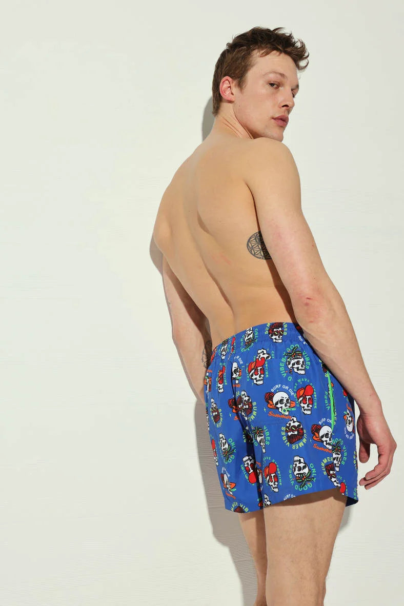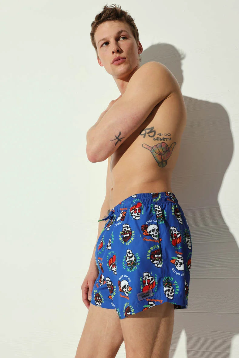 Estampado llamativo de calaveras con la frase "Catch the Surf".