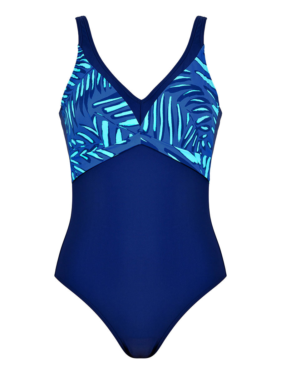 Elegante bañador de una pieza de la marca Naturana, diseñado para ofrecer efecto moldeador y realzar la silueta con comodidad y estilo. Combina un favorecedor color marino liso con un sutil estampado, creando un diseño equilibrado y atemporal.