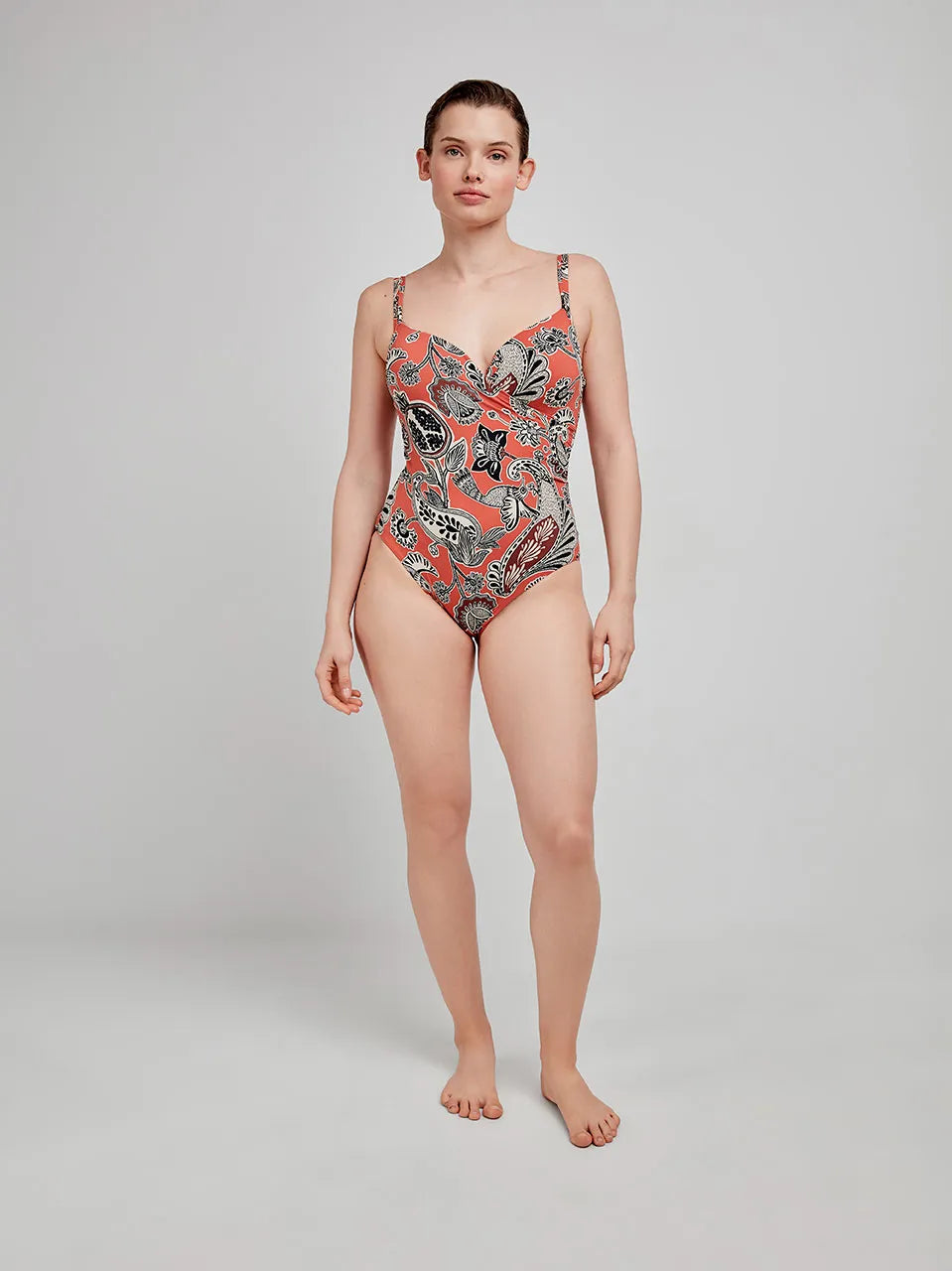 Este bañador de mujer plus size combina elegancia, sujeción y confort en una sola prenda. Diseñado con efecto moldeador, ayuda a estilizar la figura de forma natural gracias a su foam integrado (relleno ligero) y al cruce decorativo en el escote, que realza el busto sin necesidad de aros.