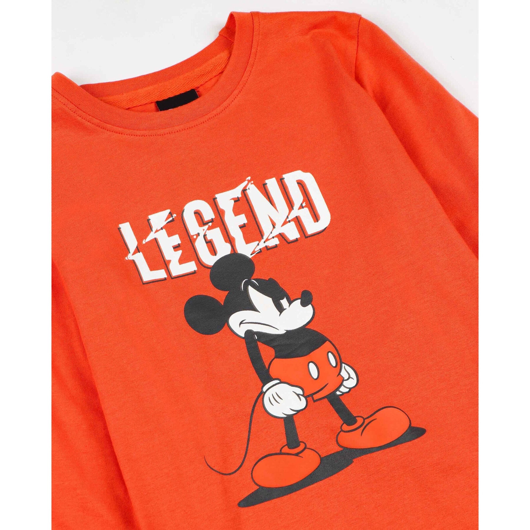 - Camiseta: Con un color naranja vibrante, la camiseta cuenta con un motivo impreso y detalles en relieve, personalizando aún más el look con la icónica imagen de Mickey Mouse.