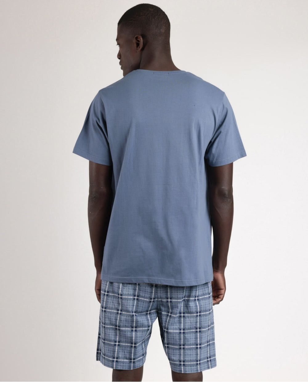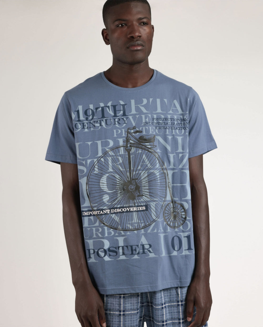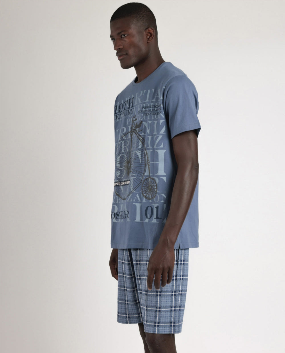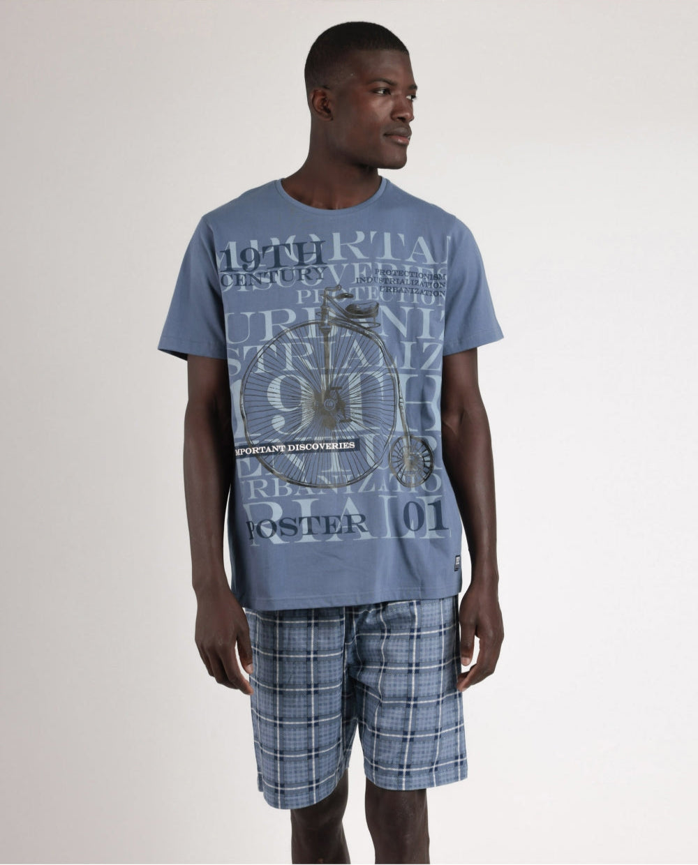 La camiseta azul de manga corta con estampado frontal de bicicleta y el pantalón corto de cuadros con cinturilla ajustable y bolsillos hacen de este pijama una prenda práctica y atractiva. Además, su diseño exclusivo ha sido desarrollado por Aznar Innova para la reconocida marca Admas.