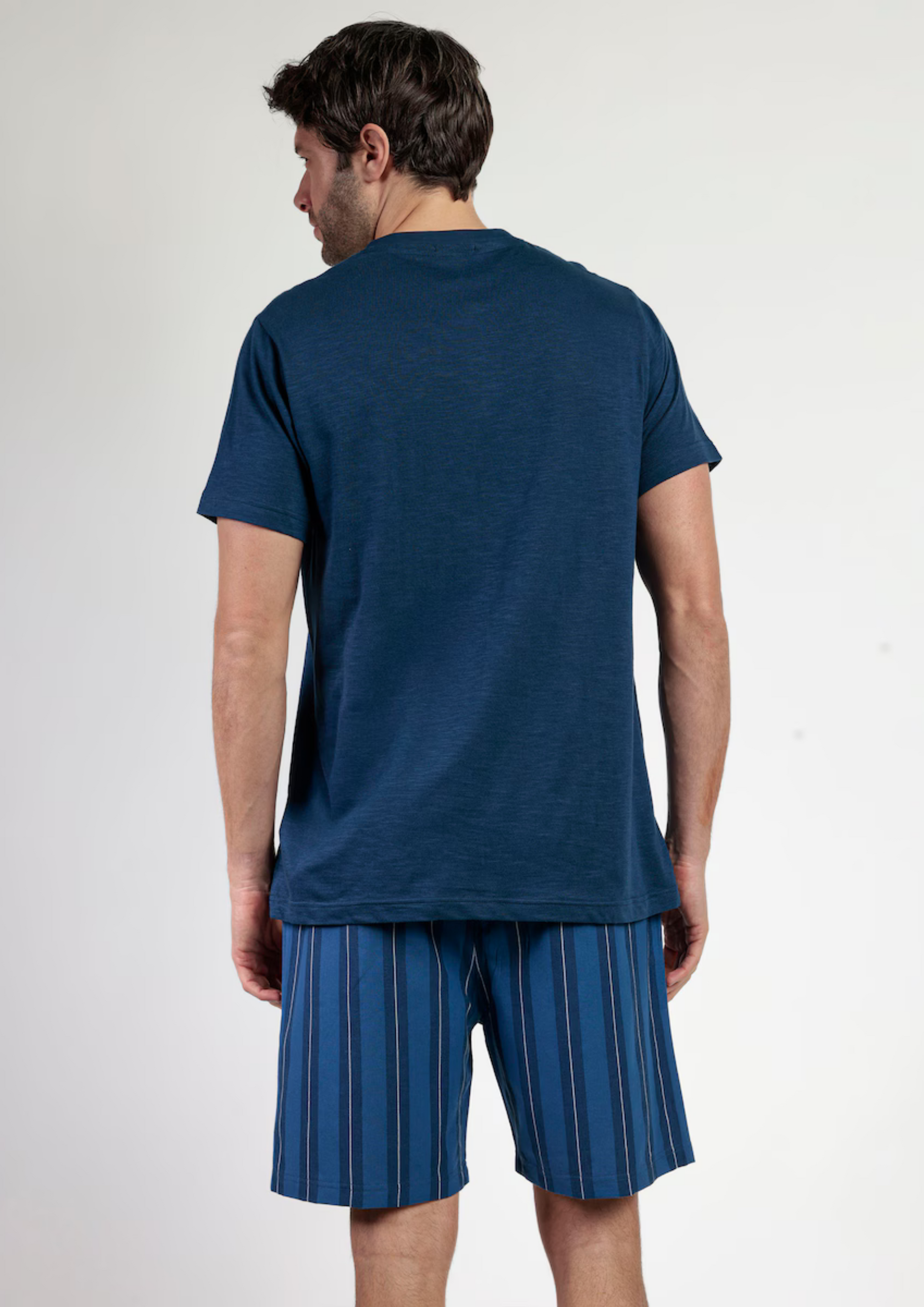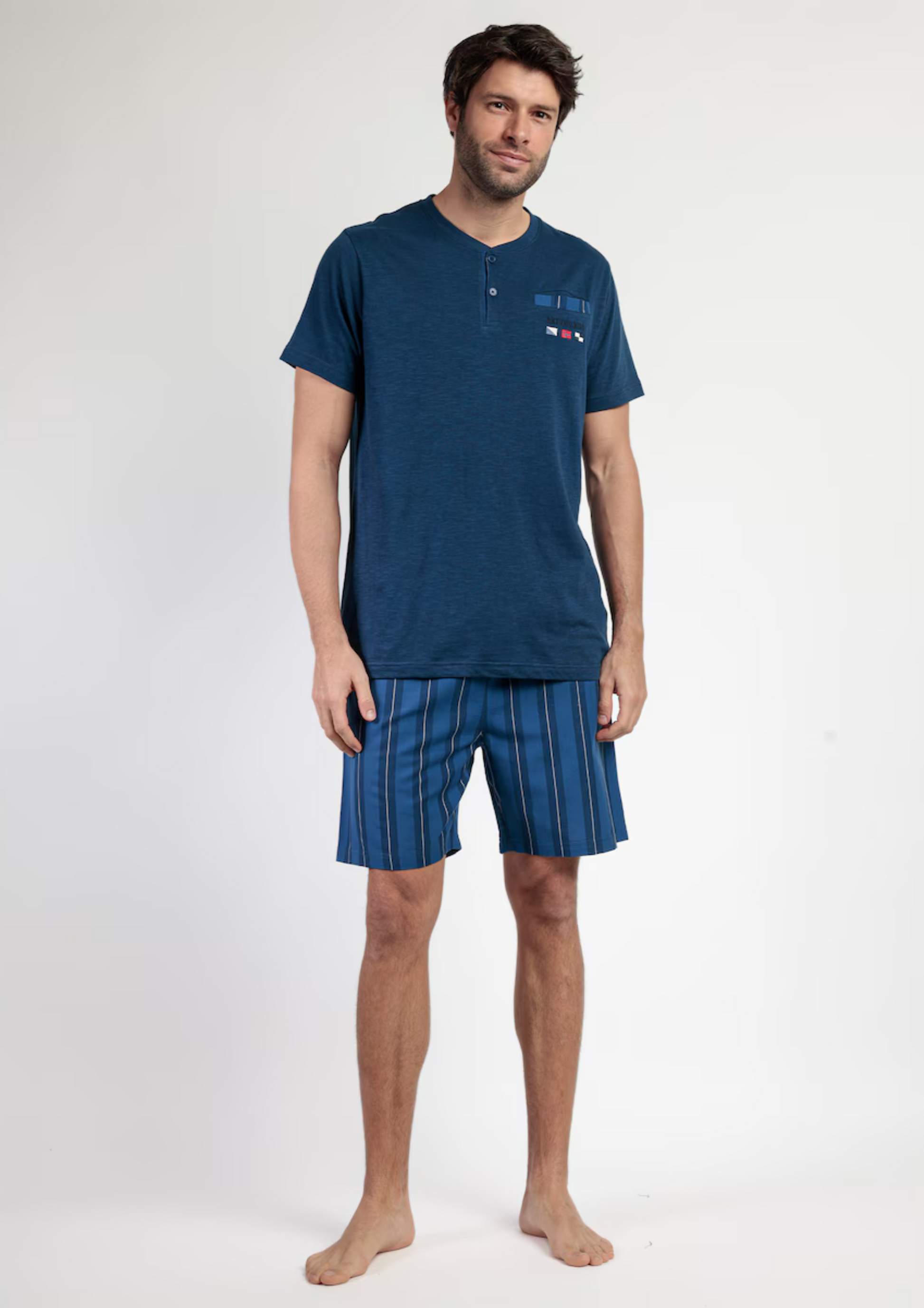 La camiseta de punto slub azul, con cuello de tapeta con botones, incluye detalles bordados y un bolsillo funcional en el pecho, aportando un toque elegante y sofisticado. El pantalón corto de popelín con rayas tejidas, incorpora bolsillos laterales y cinturilla ajustable para un ajuste cómodo y práctico.