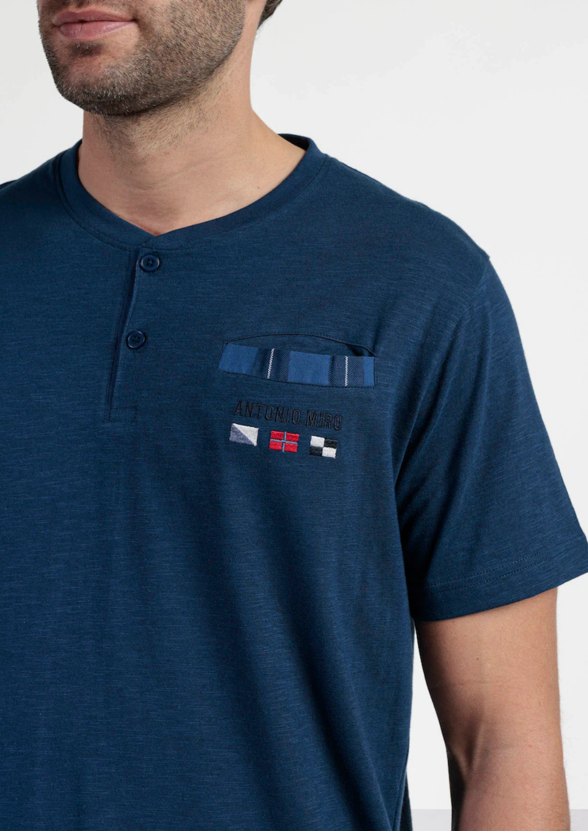 Camiseta azul con tapeta de botones, bordado y bolsillo en el pecho