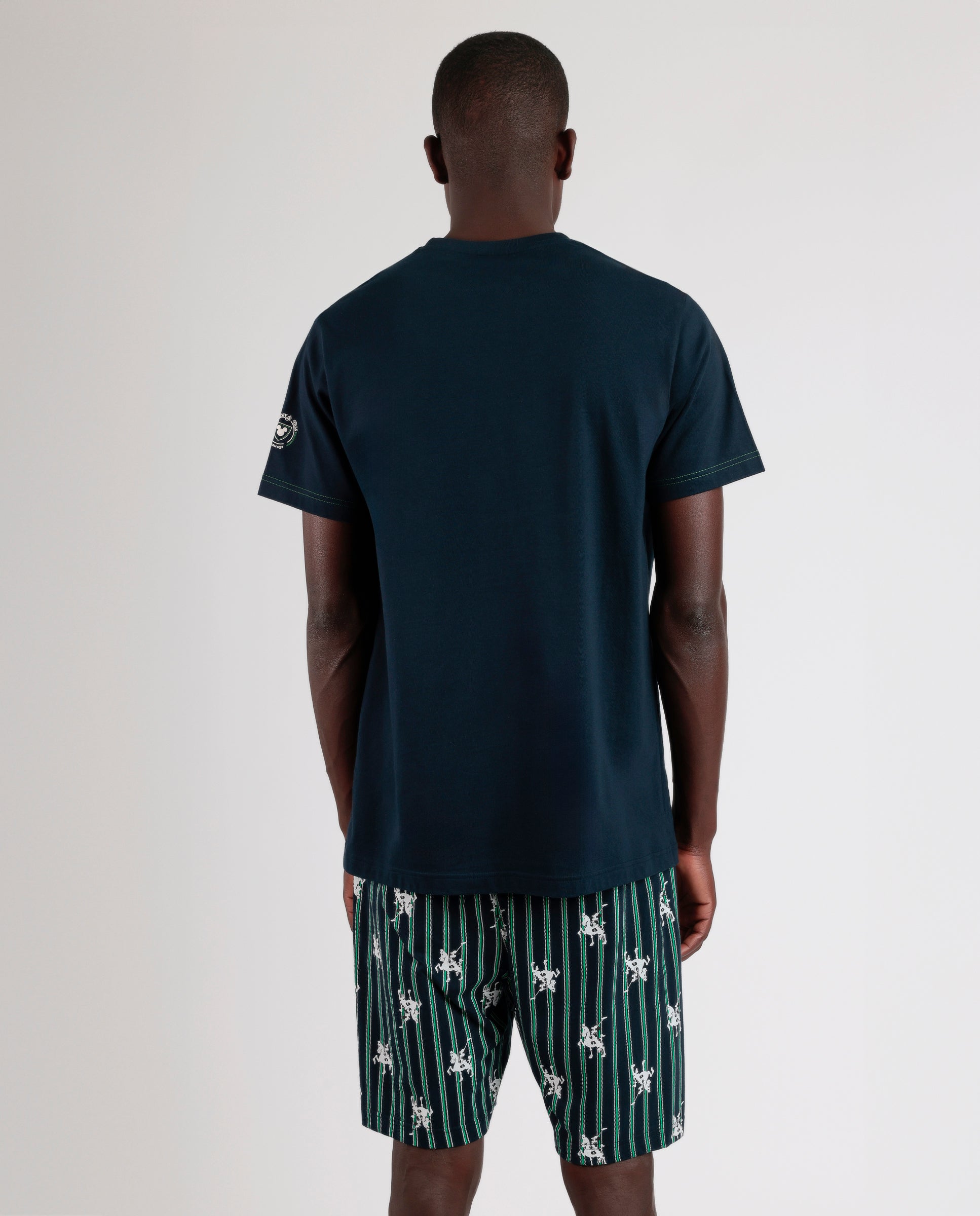 Si te gusta la comodidad con un toque discreto de fantasía, este pijama de hombre Disney es justo lo que necesitas. Con un diseño sencillo pero lleno de encanto, incluye una camiseta de manga corta con dibujo pequeño y un pantalón corto estampado de rayas que añade un estilo moderno y relajado.