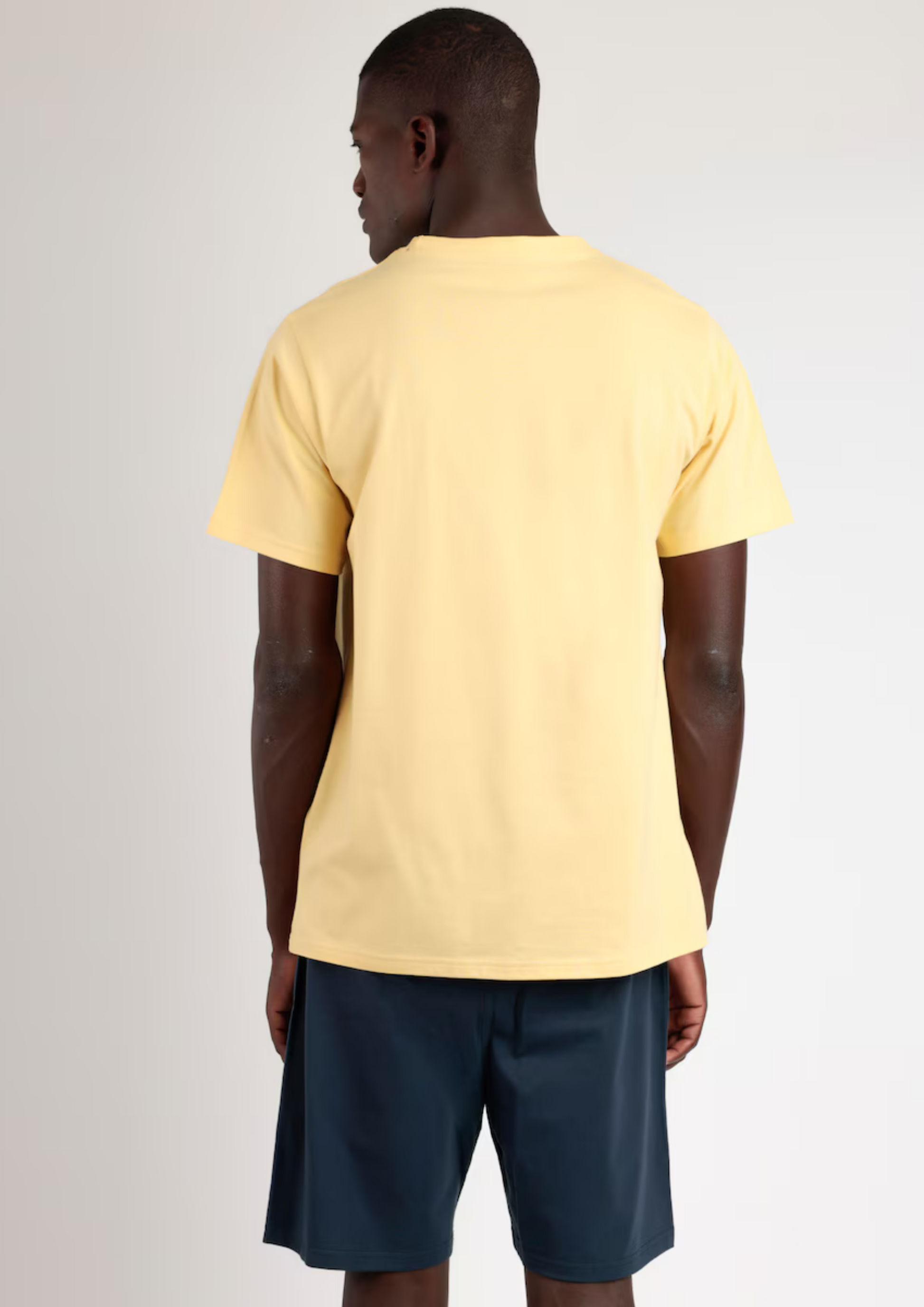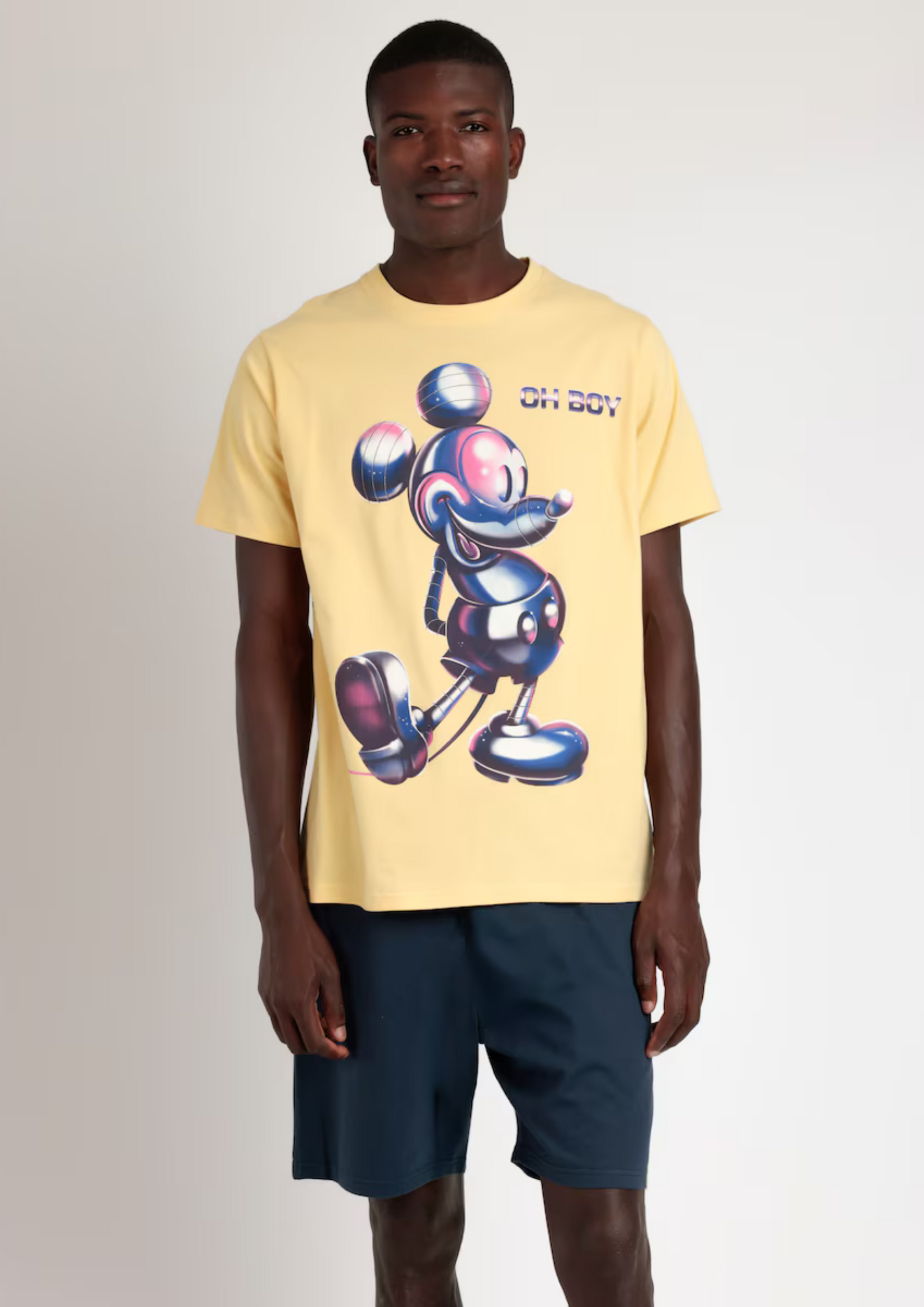 La camiseta amarilla, con dibujo frontal estampado, aporta un toque juvenil y moderno. El pantalón corto color marengo incorpora cintura elástica ajustable y bolsillo trasero, combinando funcionalidad y estilo.