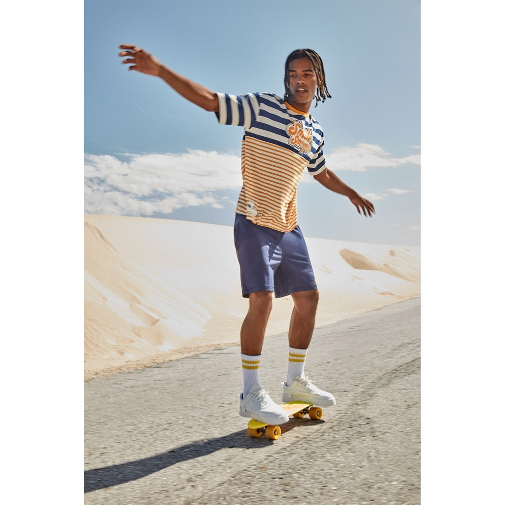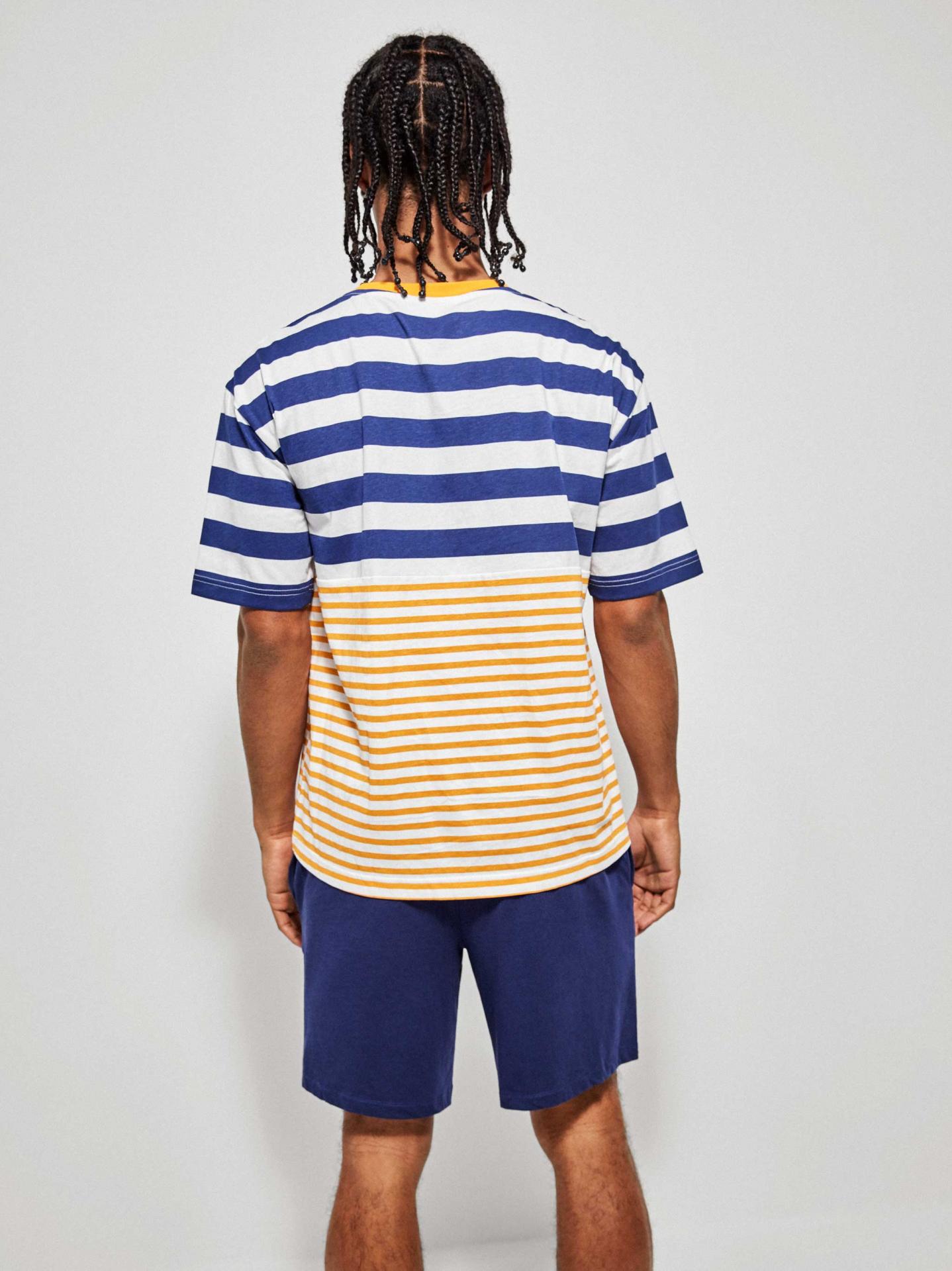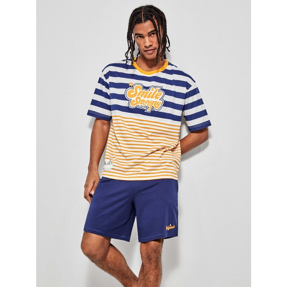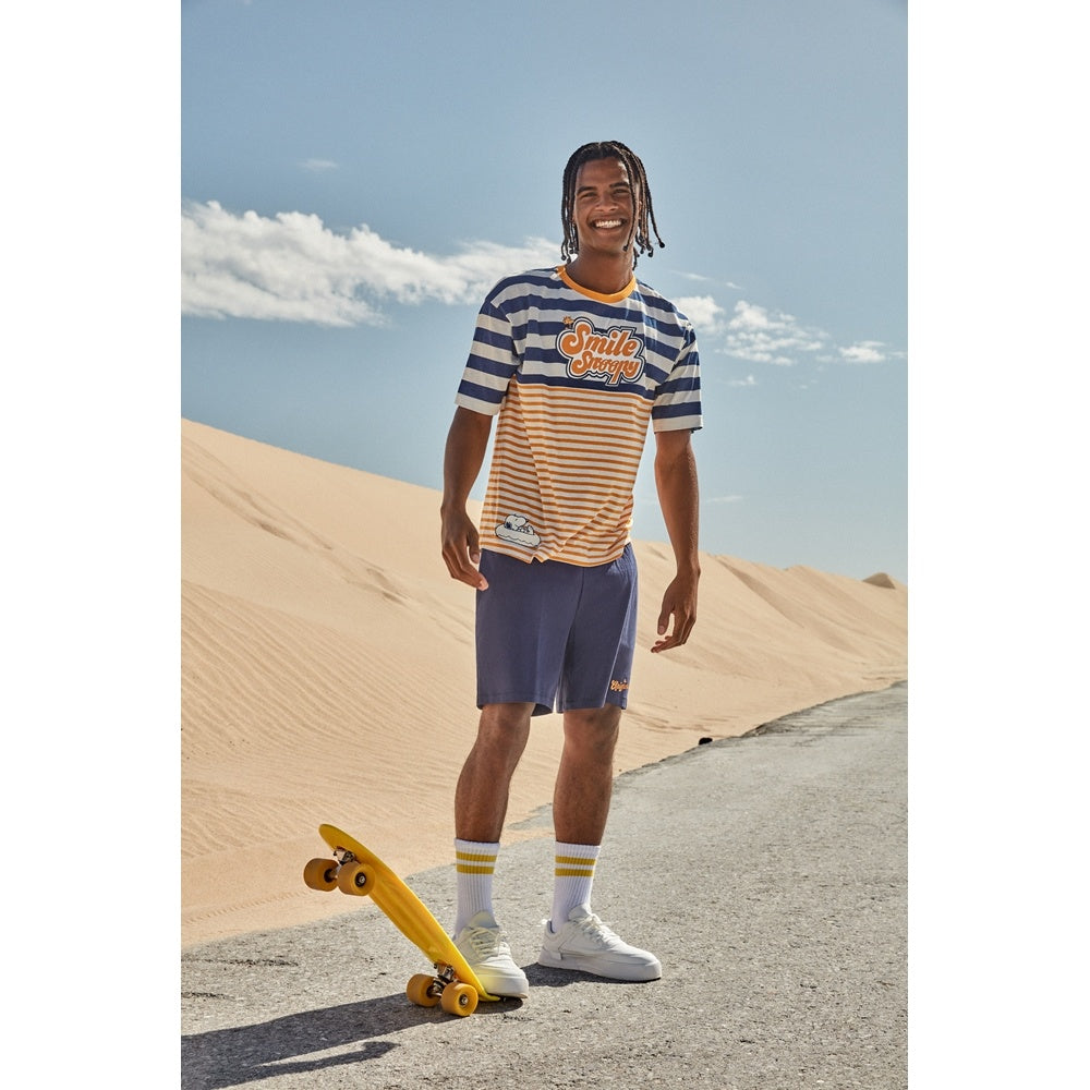 La camiseta de manga corta destaca por su estampado de rayas multicolor y un print central de Snoopy, que le da un toque juvenil y desenfadado. El pantalón corto a contraste, además de moderno, es muy funcional, gracias a su cinturilla elástica y bolsillos laterales.