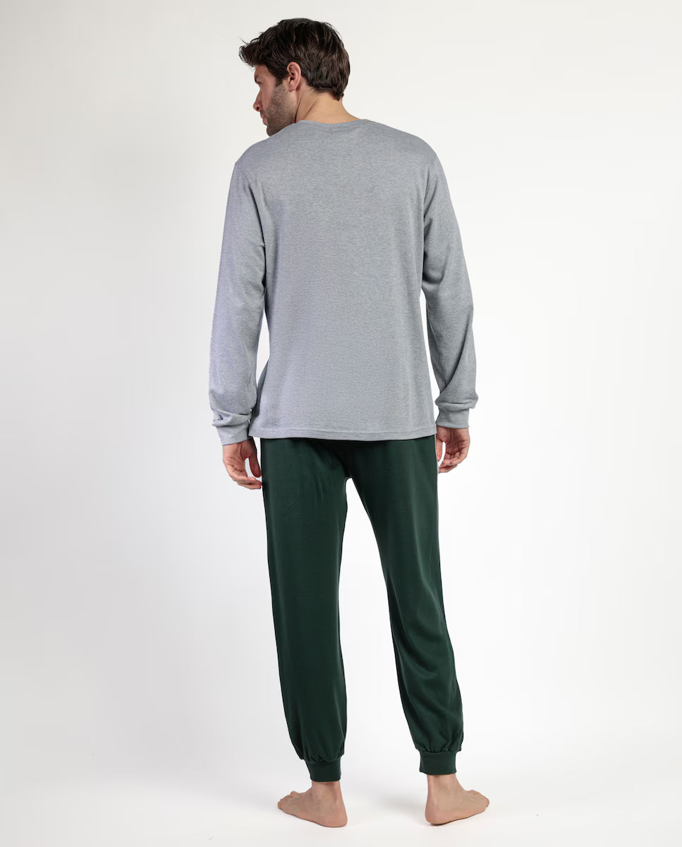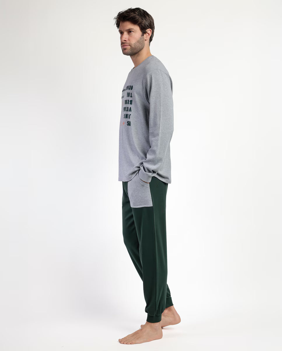 Pijama de punto de algodón, de manga larga, cuello redondo y pantalón largo. La camiseta, confeccionada en punto interlock vigoré y en color gris jaspe, incluye detalles en relieve y un diseño exclusivo de la marca Lois.