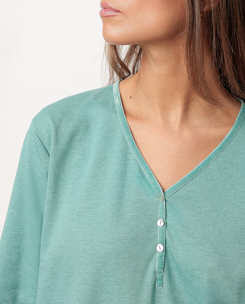 Pijama de punto de algodón con camiseta de manga larga y cuello con tapeta de botones, en color aqua, de diseño personalizado por Admas Classic. El pantalón, también de punto interlock, cuenta con cinturilla elástica con cordón y ofrece un tacto suave y agradable que aporta confort en cada uso. Un conjunto cómodo, cálido y exclusivo, creado por Admas Classic y desarrollado por Aznar Innova.