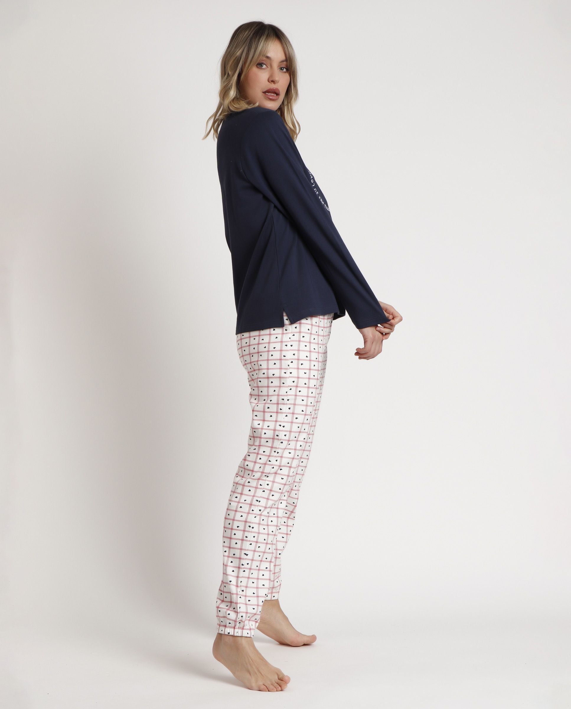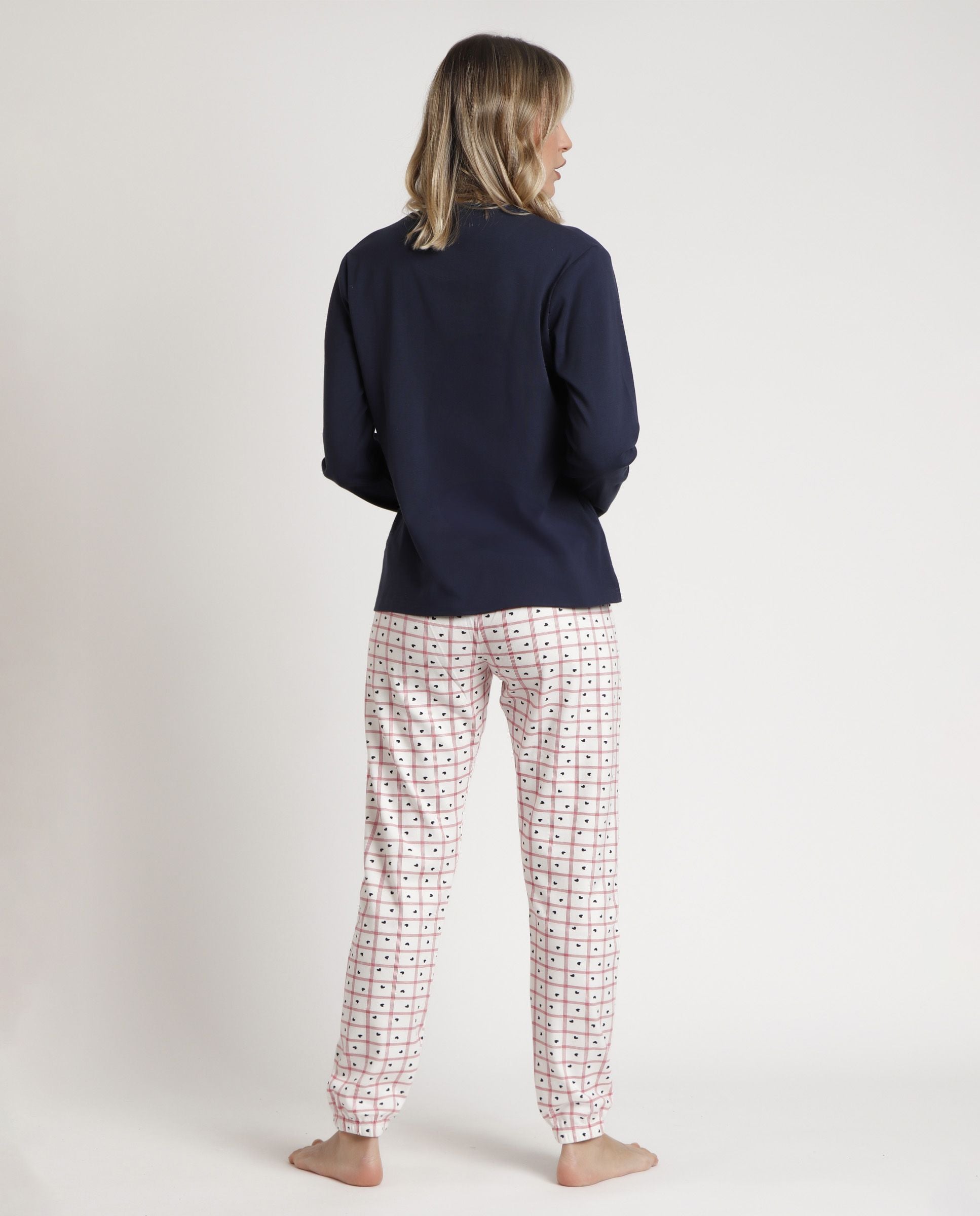 Disfruta de noches cómodas y llenas de estilo con este pijama de Admas 💖. Confeccionado en suave punto de algodón, incluye una camiseta de manga larga en color marino con detalles bordados y un pantalón estampado de cuadros con cinturilla ajustable, perfecto para moverte y descansar con total confort.