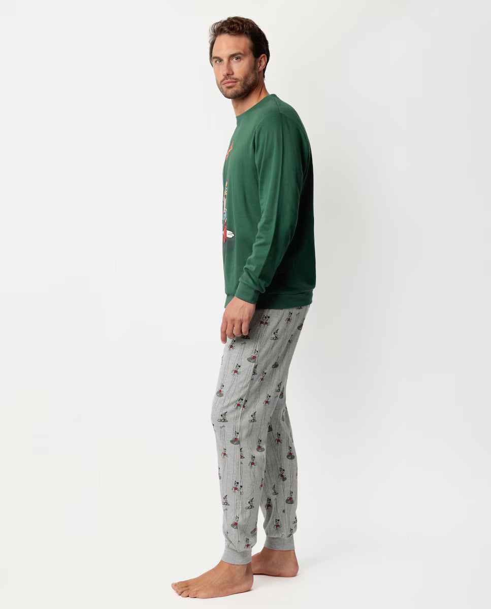Pijama de hombre de la colección Disney, confeccionado en punto de algodón para ofrecer confort y suavidad durante toda la noche. La camiseta de manga larga, en color verde, cuenta con un detalle flocado y está realizada en punto interlock. El pantalón, en punto vigoré, incluye cinturilla elástica con cordón y bolsillo trasero, garantizando un ajuste cómodo y funcional. Este conjunto exclusivo de Disney, diseñado por Aznar Innova, es perfecto para disfrutar del descanso en casa con estilo.