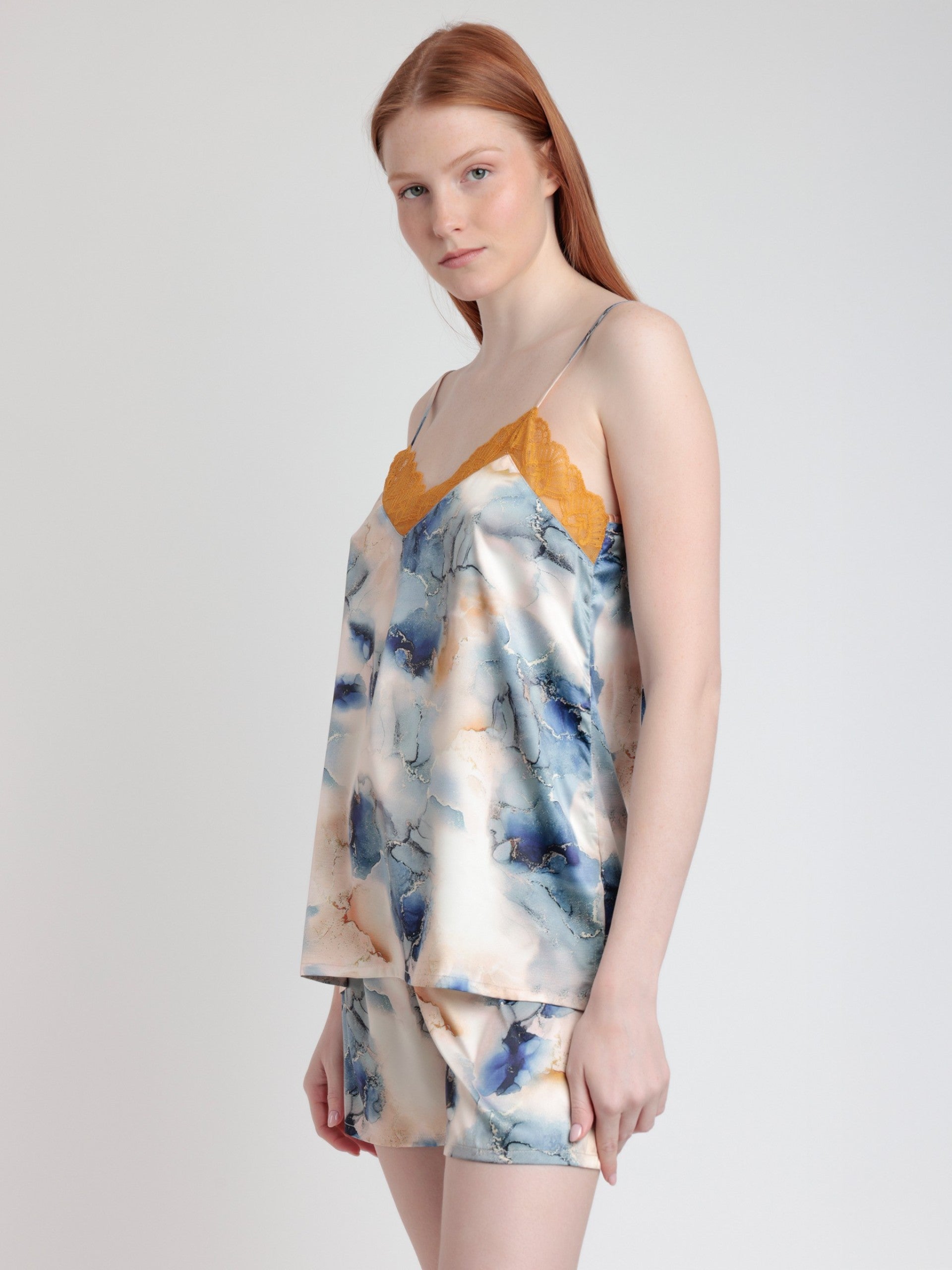 La camiseta satinada de tirantes finos presenta un escote en pico adornado con puntilla lencera, aportando un aire delicado y sensual. Sus tirantes regulables aseguran un ajuste perfecto. El conjunto se completa con un pantalón corto satinado de estampado multicolor, con cinturilla ajustable para mayor confort.
