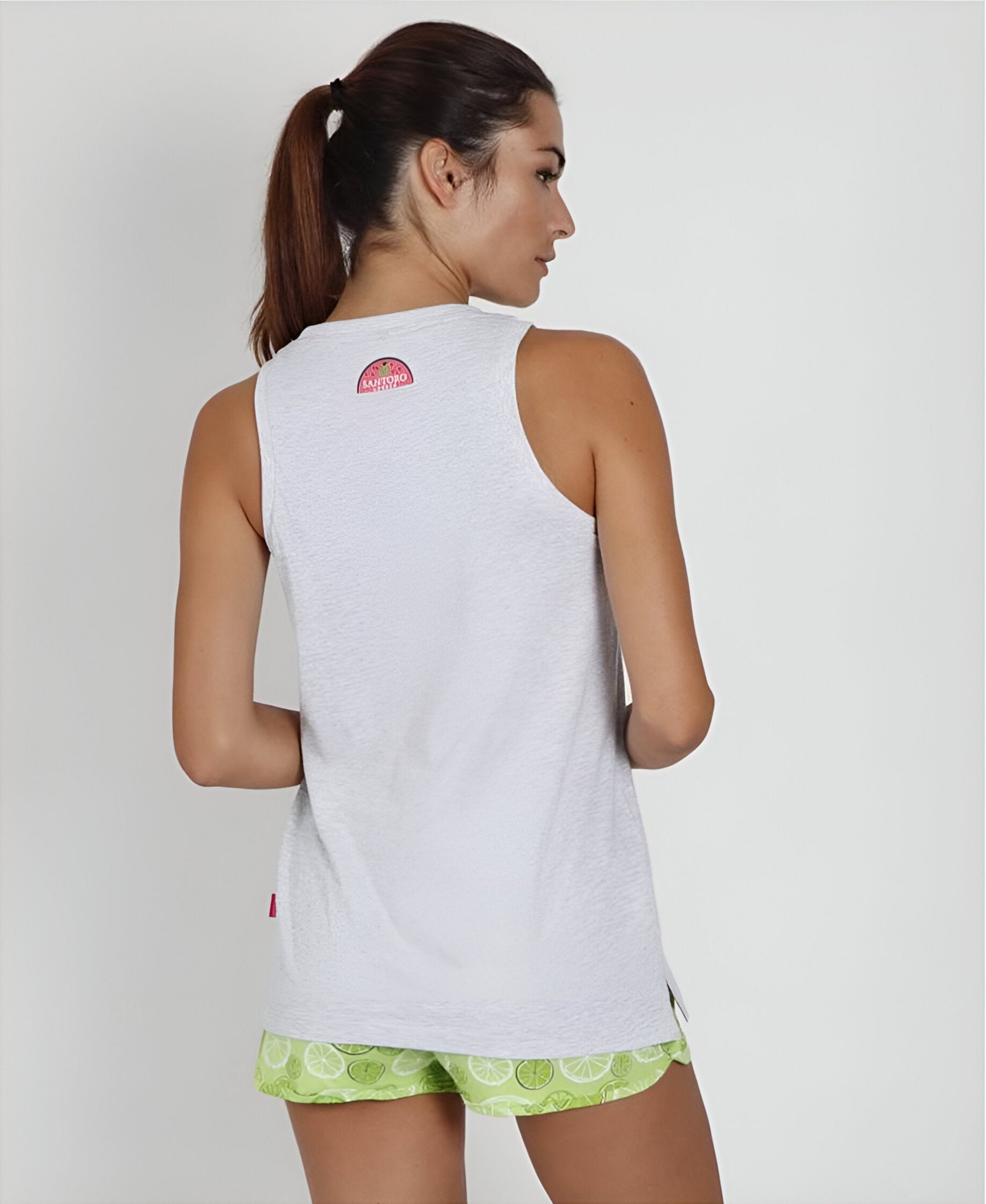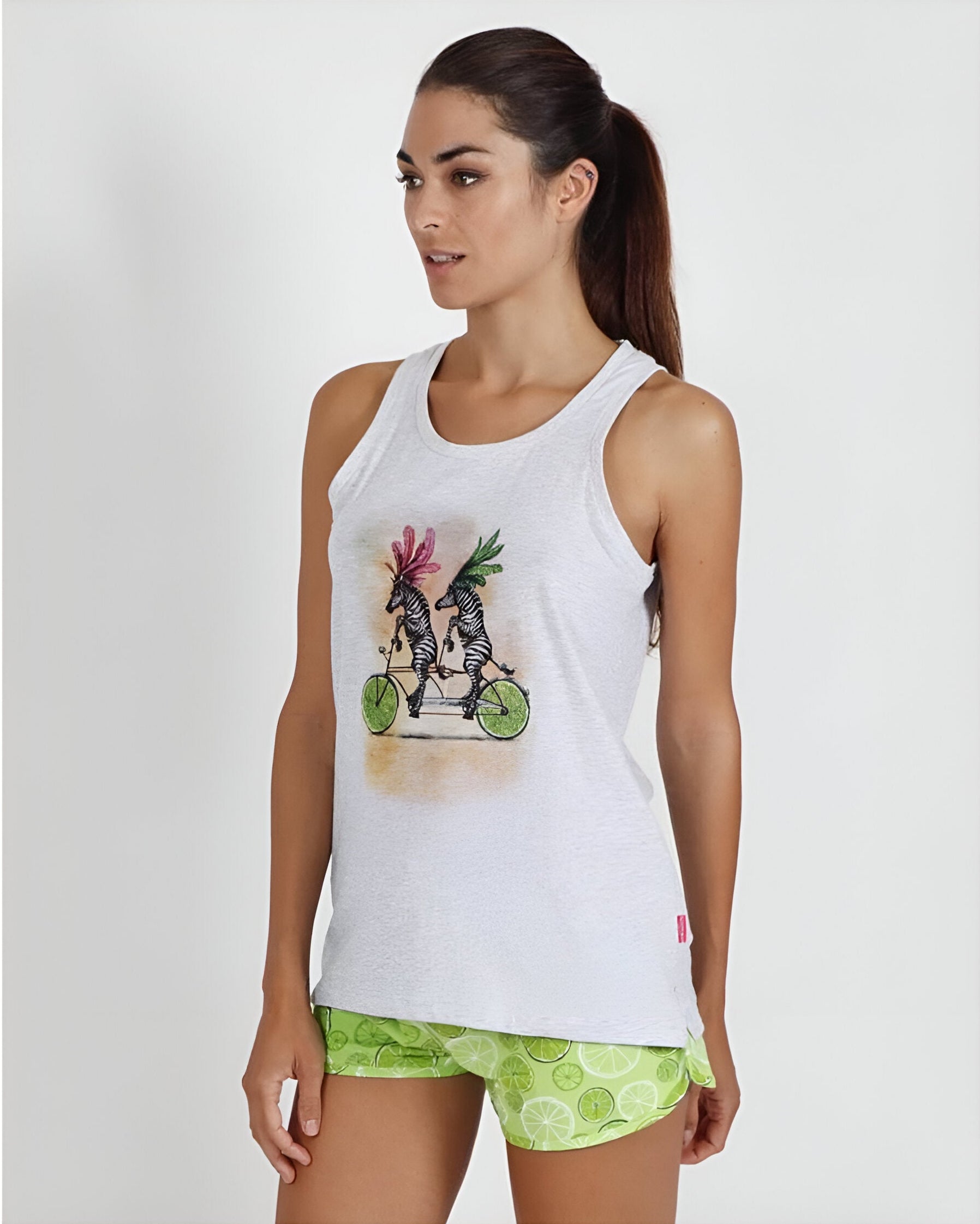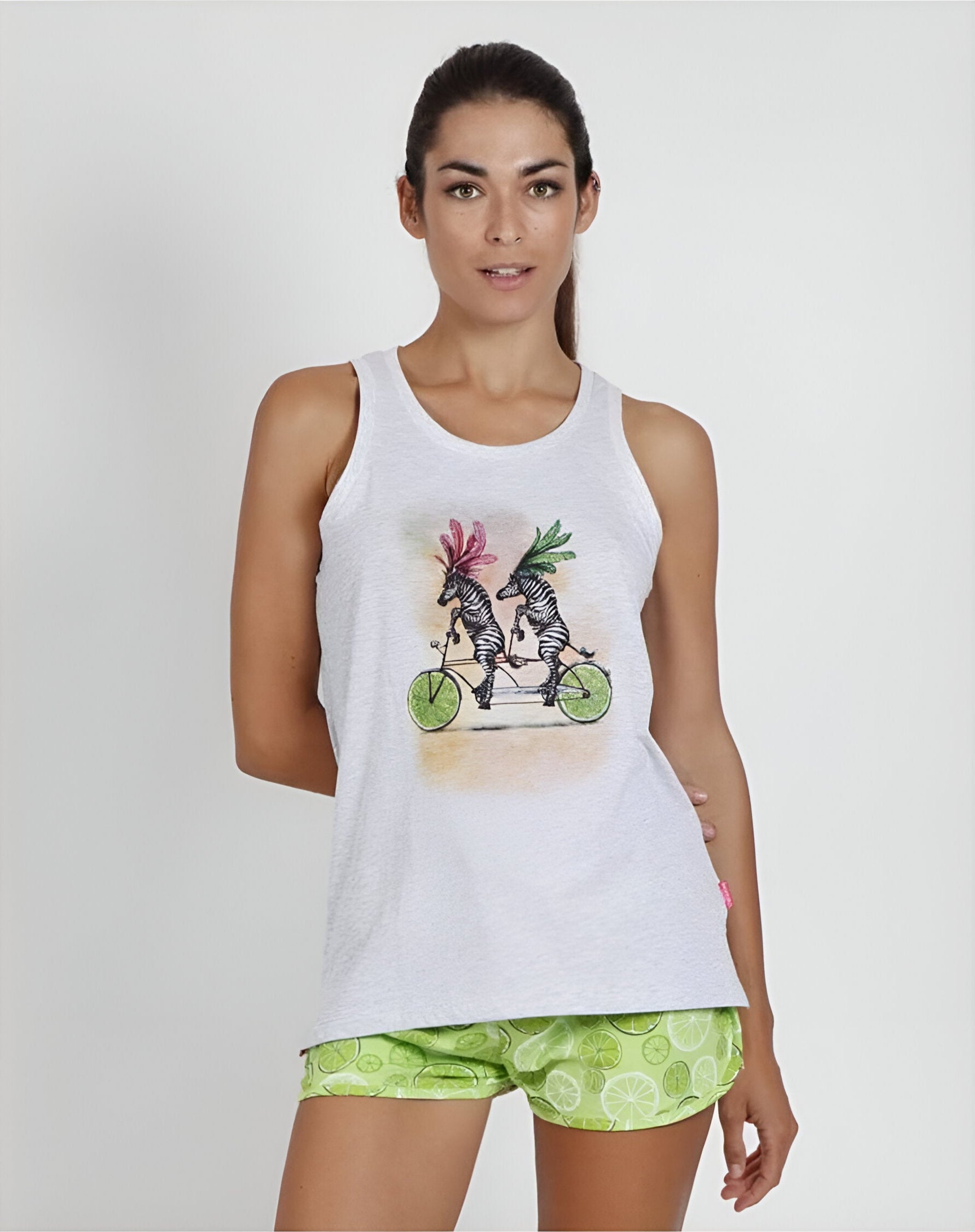 La camiseta blanca de tirantes, con cuello redondo, luce un llamativo estampado de cebras en la parte frontal. El pantalón corto, con un alegre estampado de limones y limas, incorpora una cintura elástica ajustable que garantiza confort y libertad de movimiento durante toda la noche.