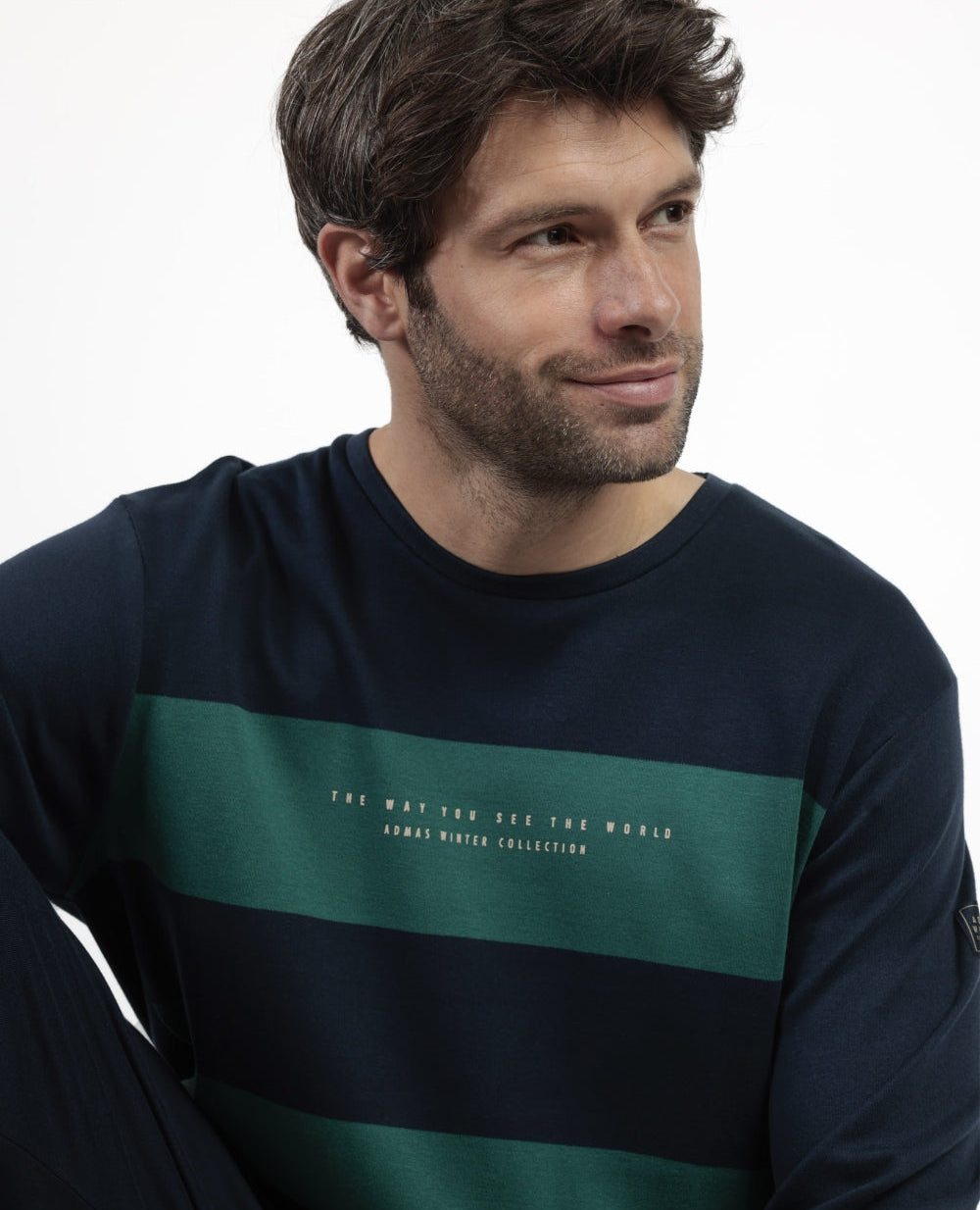 ADMAS Pijama Manga Larga The Way You See para Hombre es un conjunto cómodo y moderno, confeccionado en suave punto de algodón. La camiseta de manga larga, en color marino, presenta una raya tejida y diseño personalizado de la marca Admas. El pantalón de punto interlock incluye cinturilla elástica con cordón, bolsillos laterales y puños, ofreciendo confort y ajuste durante toda la noche. Ideal para relajarte en casa con estilo y comodidad.