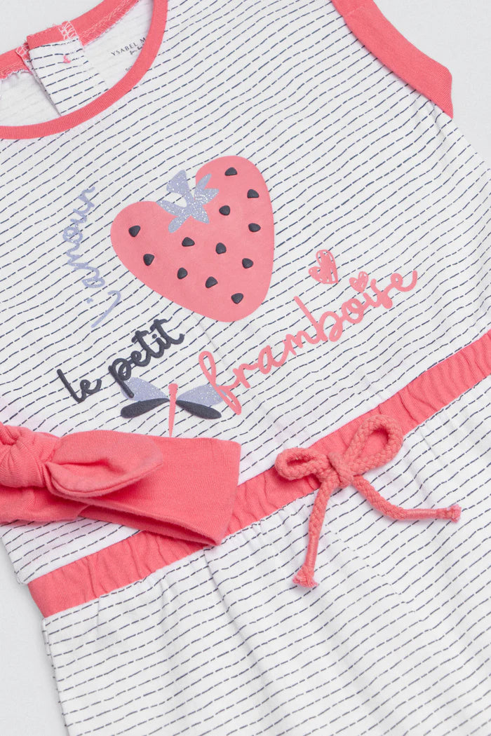 El vestido presenta un alegre estampado de rayas y un dibujo central de fresa, que aporta un toque divertido y tierno. El conjunto incluye una diadema a juego con lazo, ideal para completar un look veraniego y adorable.