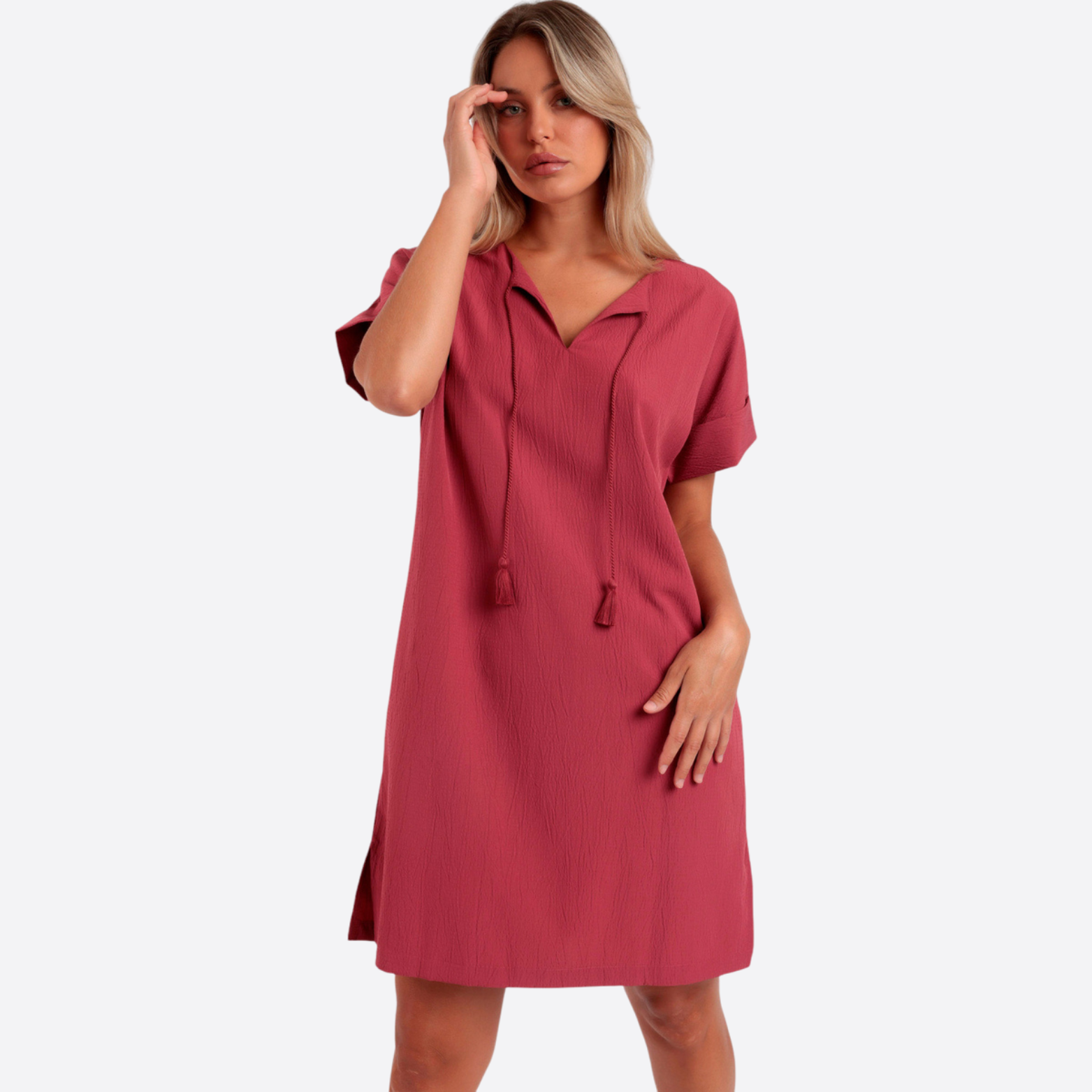 VESTIDO TEXTURIZADO CON BORLAS CARMIN